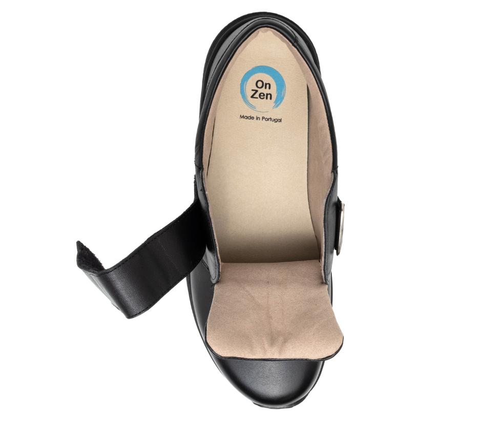 A abertura longitudinal ampla, facilita o calçar, mesmo em pés sensíveis ou inchados.
